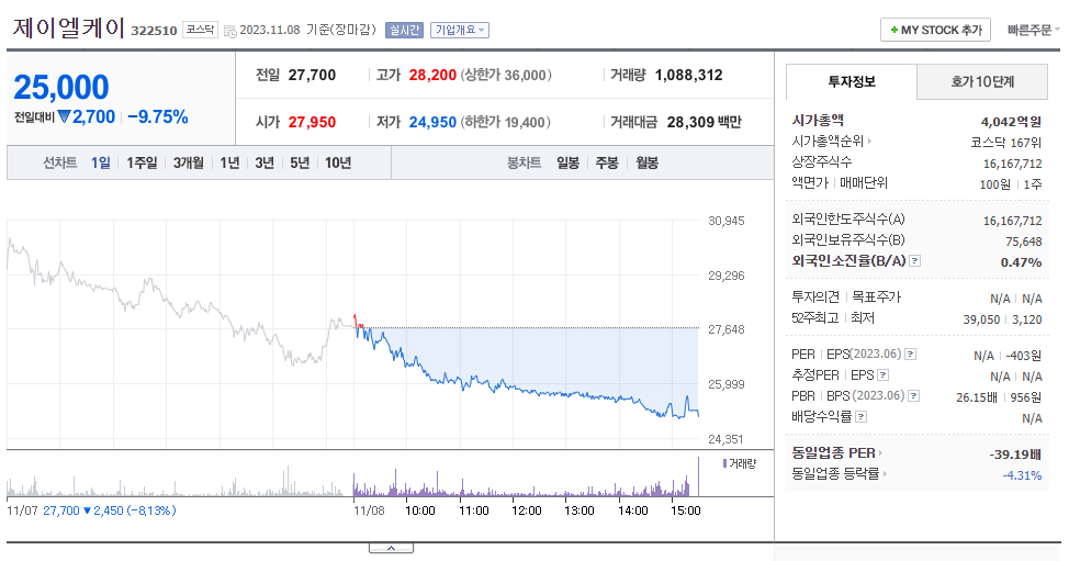 제이엘케이 현재 주가는 27,700원이며 전일 대비 -2,450원의 모습을 보이고 있습니다. 제이엘케이의 주주현황을 살펴보면 김원태(외 1인)이 지분 25.70%를 소유하고 있습니다. 제이엘케이는 의료 장비 및 서비스 기업으로 장중 기준으로 주가는 27,700원 입니다. 제이엘케이 시가 총액은 4042억 원이며 발행 주식수는 0.47주 입니다. 외국인 보유 비중은 925,648% 이며 장중 거래량은 16,167,712를 기록했습니다. 매출액은 12억 원, 영업이익은 -86억 원을 달성했습니다.제이엘케이 주식 배당수익률은 -73% 입니다.