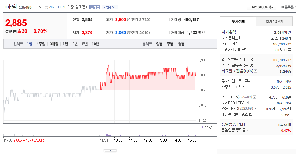 하림 현재 주가는 2,865원이며 전일 대비 -0.17원의 모습을 보이고 있습니다. 하림의 주주현황을 살펴보면 하림지주(외 4인)이 지분 58.89%를 소유하고 있습니다. 하림는 식료품 기업으로 장중 기준으로 주가는 2,865원 입니다. 하림 시가 총액은 3064억 원이며 발행 주식수는 3.24주 입니다. 외국인 보유 비중은 230,085% 이며 장중 거래량은 106,209,702를 기록했습니다. 매출액은 11,213억 원, 영업이익은 468억 원을 달성했습니다.