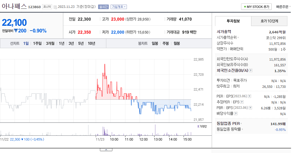 아나패스 현재 주가는 22,300원이며 전일 대비 -100원의 모습을 보이고 있습니다. 아나패스의 주주현황을 살펴보면 이경호(외 3인)이 지분 15.11%를 소유하고 있습니다. 아나패스는 디스플레이 및 관련부품 기업으로 장중 기준으로 주가는 22,300원 입니다. 아나패스 시가 총액은 2646억 원이며 발행 주식수는 1.35주 입니다. 외국인 보유 비중은 21,410% 이며 장중 거래량은 11,972,856를 기록했습니다. 매출액은 300억 원, 영업이익은 -70억 원을 달성했습니다.
