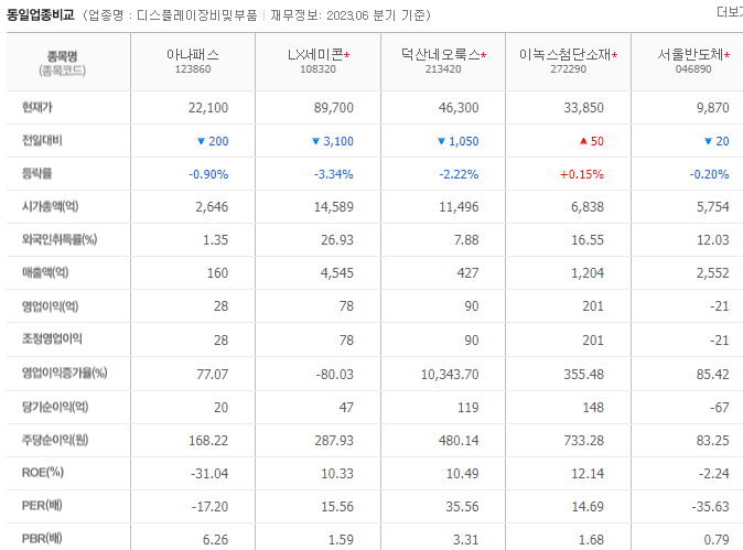 -2023년 6월 전년동기 대비 별도기준 매출액은 32.7% 증가, 영업이익은 400.6% 증가, 당기순이익은 41.3% 감소. 고기능, 고사양을 통한 SET 제조원가 절감방안 제시하고, 고집적, 공정다변화를 통한 칩제조원가 절감 및 수익성을 확보하고자 함. 세계적인 디스플레이 부품기업과 경쟁하기 위해 빠르게 변화하는 기술수요를 파악하여 선행제품을 개발함으로써 새로운 수요를 창출하여 글로벌 고객기반을 갖추고자 함.