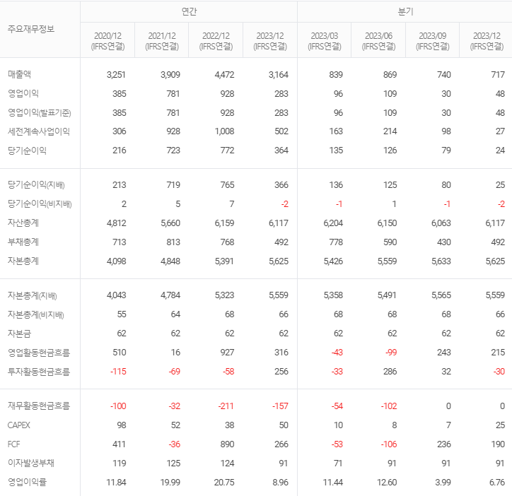 -2023년 9월 전년동기 대비 연결기준 매출액은 28.4% 감소, 영업이익은 69.5% 감소, 당기순이익은 54.9% 감소. 내년에는 삼성전자 D램 1znm 이하 비중 확대로 어닐링 장비 매출이 증가하며, 레이저 커팅 장비 국산화에 따른 실적 성장이 예상됨. 그루빙 장비와 스텔스 다이싱 장비 시장에 진입할 것으로 전망되며 그루빙 장비의 경우 파운드리 고객사에 납품을 시작했고, 2024년 상반기 본격 매출 인식이 예상되고 있음.