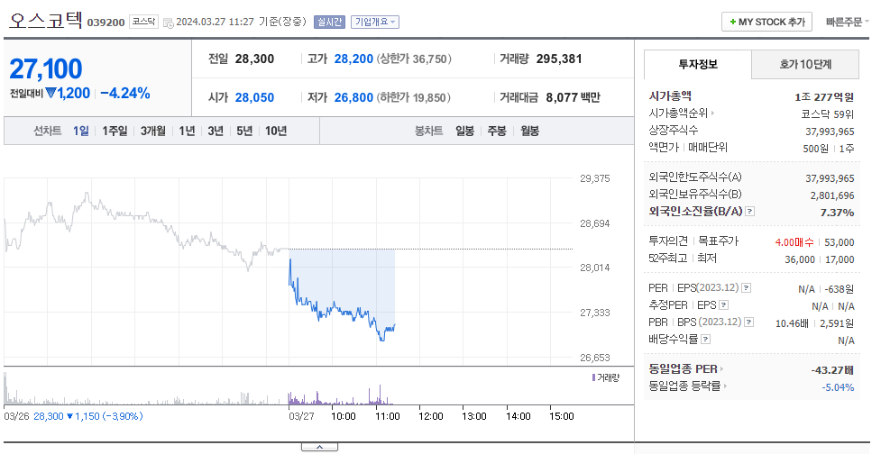 오스코텍 현재 주가는 28,300원이며 전일 대비 -1,150원의 모습을 보이고 있습니다. 오스코텍의 주주현황을 살펴보면 김정근 주주가 전체 지분 12.94%를 소유하고 있습니다. 오스코텍는 의료 장비 및 서비스 기업으로 장중 기준으로 주가는 28,300원 입니다. 오스코텍의 시가 총액은 1조372억 원이며 발행 주식수는 37,993,965주 입니다. 외국인 보유 비중은 7.37% 이며 장중 거래량은 610,934원 을 기록했습니다. 매출액은 50억 원을 달성했습니다. EPS는 원이며 오스코텍 주식 배당수익률은 10,752% 입니다.