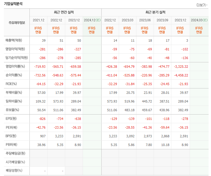 -2023년 9월 전년동기 대비 연결기준 매출액은 25.9% 증가, 영업손실은 1.3% 감소, 당기순손실은 31.3% 감소. 매출은 조금씩 성장하고 있으나 전체적인 볼륨이 부족하여 큰 폭의 적자가 지속 중. 원재료 가격의 상승 및 주력 제품인 골이식재의 생산 가동률이 41.4%에 그침. 치과용 골이식재와 치과용 차폐막 사업의 해외시장 진출을 위해 FDA 승인 준비 중.