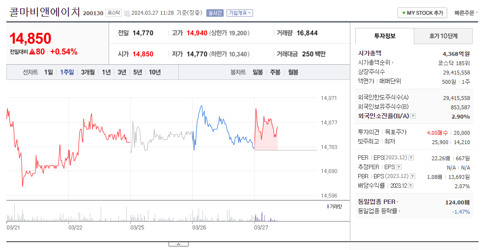 이 글에서는 콜마비앤에이치 주가 전망과 목표 주가, 기업 정보에 대해서 설명합니다. 주식 투자에서 핵심은 미래의 기업 가치를 예상하고 선제적으로 움직이는 것입니다. 투자 대상을 결정하기 전에 현재 기업의 현황과 수치를 검토하는 것이 필요합니다. 콜마비앤에이치 주식의 주요 현황과 투자 정보를 확인하시고 주식 투자에 도움이 될 만한 정보들을 모아 놓았으니 투자 시 참고하시기 바랍니다..