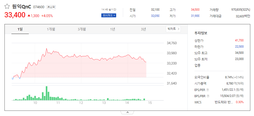 원익QnC 현재 주가는 32,100원이며 전일 대비 원의 모습을 보이고 있습니다. 원익QnC의 주주현황을 살펴보면 원익홀딩스 주주가 전체 지분 40.62%를 소유하고 있습니다. 원익QnC는 반도체 및 관련장비 기업으로 장중 기준으로 주가는 32,100원 입니다. 원익QnC의 시가 총액은 8793억 원이며 발행 주식수는 26,288,000주 입니다. 외국인 보유 비중은 8.74% 이며 장중 거래량은 300,901원 을 기록했습니다. 매출액은 8,059억 원을 달성했습니다. EPS는 1,651원이며 원익QnC 주식 배당수익률은 0.72% 입니다.