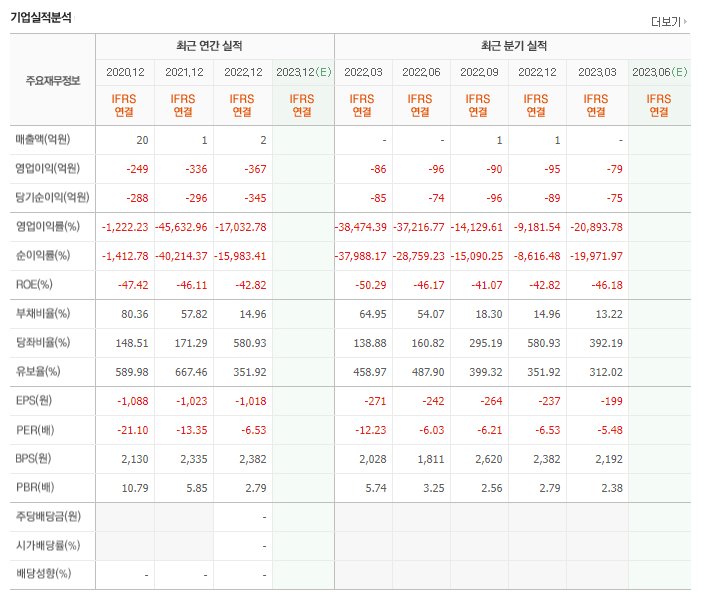 -2022년 12월 전년동기 대비 연결기준 매출액은 191.9% 증가, 영업손실은 9.5% 증가, 당기순손실은 14.3% 증가. 자기자본비율은 전년 대비 23.62%p 증가한 86.98%, 부채비율은 전년 대비 42.86%p 감소한 14.96%로 재무건전성은 개선됐음. 2022년 12월 글로벌 전문경영인을 영입하며 향후 비전 및 사업 전략 수립 등이 더욱 가속화될 전망이며 이를 위한 조직 정비, 개편 등도 뒤따를 예정임.