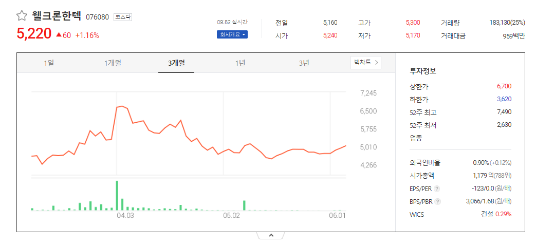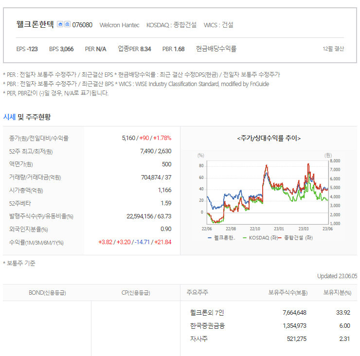 웰크론한텍 현재 주가는 5,160원이며 전일 대비 -14.71원의 모습을 보이고 있습니다. 웰크론한텍의 주주현황을 살펴보면 웰크론(외 7인)이 지분 33.92%를 소유하고 있습니다. 웰크론한텍는 건설 기업으로 장중 기준으로 주가는 5,160원 입니다. 삼성전자의 시가 총액은 1166억 원이며 발행 주식수는 0.90주 입니다. 외국인 보유 비중은 704,874% 이며 장중 거래량은 22,594,156를 기록했습니다. 매출액은 909억 원, 영업이익은 14억 원을 달성했습니다. EPS는 없음원이며 웰크론한텍 주식 배당수익률은 % 입니다.