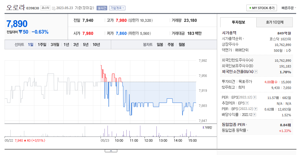 오로라 현재 주가는 7,940원이며 전일 대비 -0.63원의 모습을 보이고 있습니다. 오로라의 주주현황을 살펴보면 노희열(외 2인)이 지분 46.51%를 소유하고 있습니다. 오로라는 레저용품 기업으로 장중 기준으로 주가는 7,940원 입니다. 삼성전자의 시가 총액은 849억 원이며 발행 주식수는 1.78주 입니다. 외국인 보유 비중은 10,799% 이며 장중 거래량은 10,762,890를 기록했습니다. 매출액은 2,317억 원, 영업이익은 106억 원을 달성했습니다. EPS는 966원이며 오로라 주식 배당수익률은 615% 입니다.