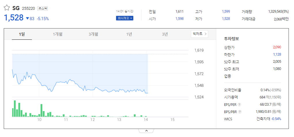 SG 현재 주가는 1,611원이며 전일 대비 -2.36원의 모습을 보이고 있습니다. SG의 주주현황을 살펴보면 박창호(외 1인)이 지분 34.24%를 소유하고 있습니다. SG는 건축소재 기업으로 장중 기준으로 주가는 1,611원 입니다. 삼성전자의 시가 총액은 692억 원이며 발행 주식수는 0.14주 입니다. 외국인 보유 비중은 22,388,365% 이며 장중 거래량은 44,756,689를 기록했습니다. 매출액은 103억 원, 영업이익은 6억 원을 달성했습니다.