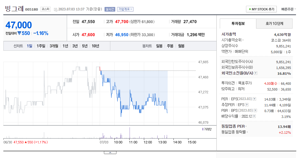 이 글에서는 빙그레 주가 전망과 목표 주가, 기업 정보에 대해서 설명합니다. 주식 투자 전에 기업 주가 정보와 재무 상태를 살펴보는 것은 굉장히 중요합니다. 빙그레 주식의 주요 현황과 투자 정보를 확인하시고 지금 시장 상태를 분석해보겠습니다.