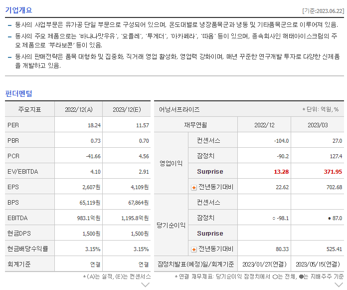 -동사의 사업부문은 유가공 단일 부문으로 구성되어 있으며, 온도대별로 냉장품목군과 냉동 및 기타품목군으로 이루어져 있음. 동사의 주요 제품으로는 '바나나맛우유', '요플레', '투게더', '아카페라', '따옴' 등이 있으며, 종속회사인 해태아이스크림의 주요 제품으로 '부라보콘’ 등이 있음. 동사의 판매전략은 품목 대형화 및 집중화, 직거래 영업 활성화, 영업력 강화이며, 매년 꾸준한 연구개발 투자로 다양한 신제품을 개발하고 있음.