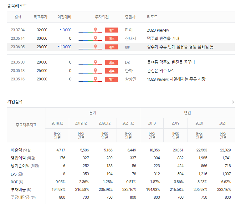 -2023년 3월 전년동기 대비 연결기준 매출액은 3.4% 증가, 영업이익은 33.4% 감소, 당기순이익은 40.7% 감소. 매출 소폭 상승에도 광고선전비가 84% 증가하는 등 판관비가 크게 증가하여 수익성 악화됨. 2023년 4월 덴마크 프리미엄 맥아를 100% 사용하고 더블숙성 공법을 적용하여 부드러운 첫맛과 강렬한 끝맛을 구현한 켈리를 출시함에 따라 매출 증대 기대.