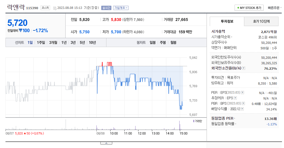 락앤락 현재 주가는 5,820원이며 전일 대비 -2.02원의 모습을 보이고 있습니다. 락앤락의 주주현황을 살펴보면 Consumer Strength Limited(외 6인)이 지분 70.76%를 소유하고 있습니다. 락앤락는 용기 및 포장 기업으로 장중 기준으로 주가는 5,820원 입니다. 락앤락의 시가 총액은 2922억 원이며 발행 주식수는 76.23주 입니다. 외국인 보유 비중은 36,006% 이며 장중 거래량은 50,200,444를 기록했습니다. 매출액은 1,144억 원, 영업이익은 23억 원을 달성했습니다. 락앤락 주식 배당수익률은 5.40% 입니다.