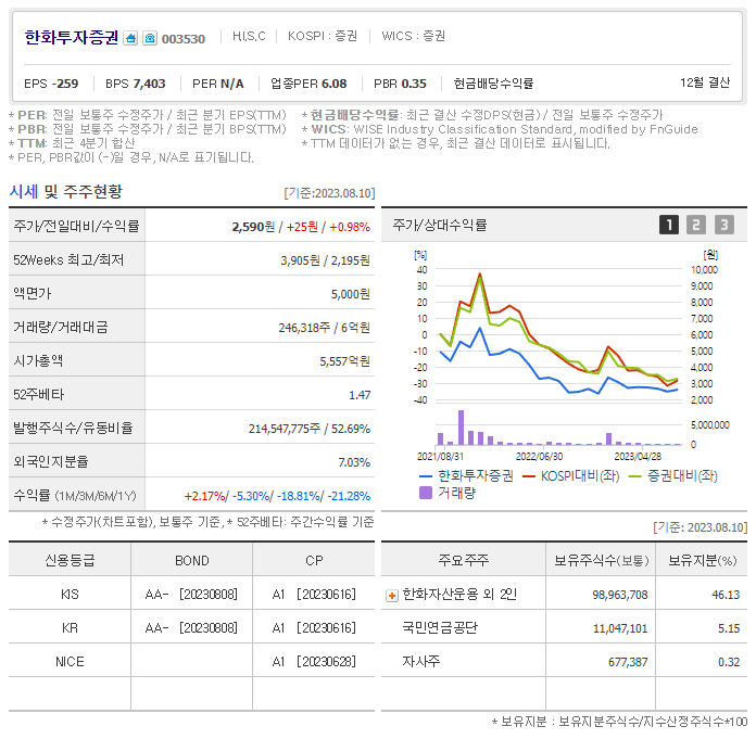 한화투자증권 현재 주가는 2,590원이며 전일 대비 -5.30원의 모습을 보이고 있습니다. 한화투자증권의 주주현황을 살펴보면 한화자산운용(외 2인)이 지분 46.13%를 소유하고 있습니다. 한화투자증권는 증권 기업으로 장중 기준으로 주가는 2,590원 입니다. 한화투자증권의 시가 총액은 5589억 원이며 발행 주식수는 7.03주 입니다. 외국인 보유 비중은 246,318% 이며 장중 거래량은 214,547,775를 기록했습니다. 매출액은 308억 원입니다.