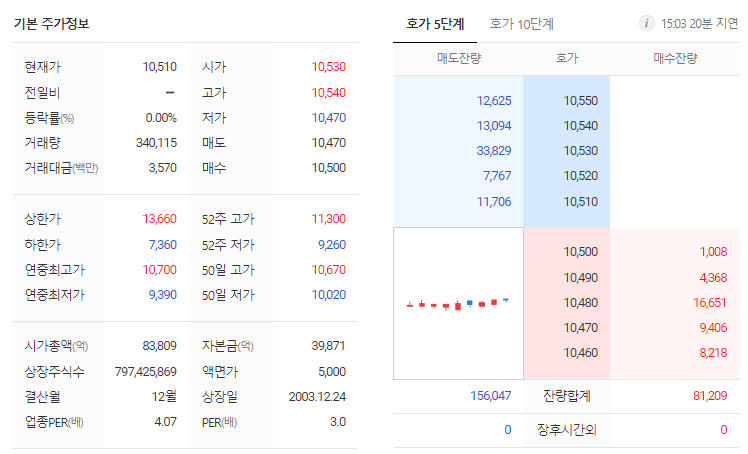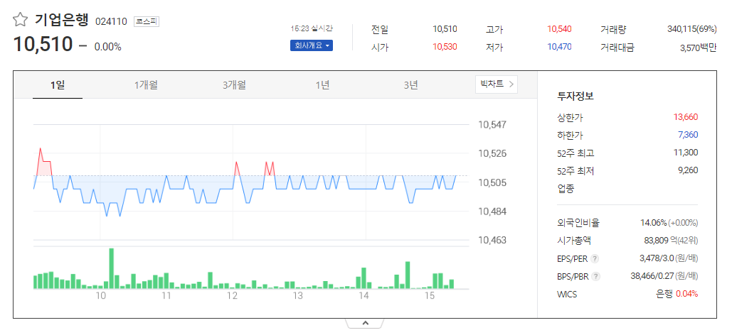 기업은행 현재 주가는 10,510원이며 전일 대비 원의 모습을 보이고 있습니다. 기업은행의 주주현황을 살펴보면 대한민국정부(기획재정부)(외 2인)이 지분 68.54%를 소유하고 있습니다. 기업은행는 상업은행 기업으로 장중 기준으로 주가는 10,510원 입니다. 삼성전자의 시가 총액은 8조3730억 원이며 발행 주식수는 14.06주 입니다. 외국인 보유 비중은 489,207% 이며 장중 거래량은 797,425,869를 기록했습니다. 매출액은 19,482억 원, 영업이익은 억 원을 달성했습니다. EPS는 3,516원이며 기업은행 주식 배당수익률은 9.78% 입니다.