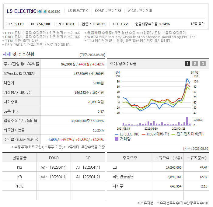 LS ELECTRIC 현재 주가는 96,300원이며 전일 대비 -4.65원의 모습을 보이고 있습니다. LS ELECTRIC의 주주현황을 살펴보면 이 지분 47.47%를 소유하고 있습니다. LS ELECTRIC는 전기장비 기업으로 장중 기준으로 주가는 96,300원 입니다. 삼성전자의 시가 총액은 3조30억 원이며 발행 주식수는 15.25주 입니다. 외국인 보유 비중은 166,382% 이며 장중 거래량은 30,000,000를 기록했습니다. 매출액은 21,775억 원, 영업이익은 1,875억 원을 달성했습니다. EPS는 7,864원이며 LS ELECTRIC 주식 배당수익률은 1.95% 입니다.