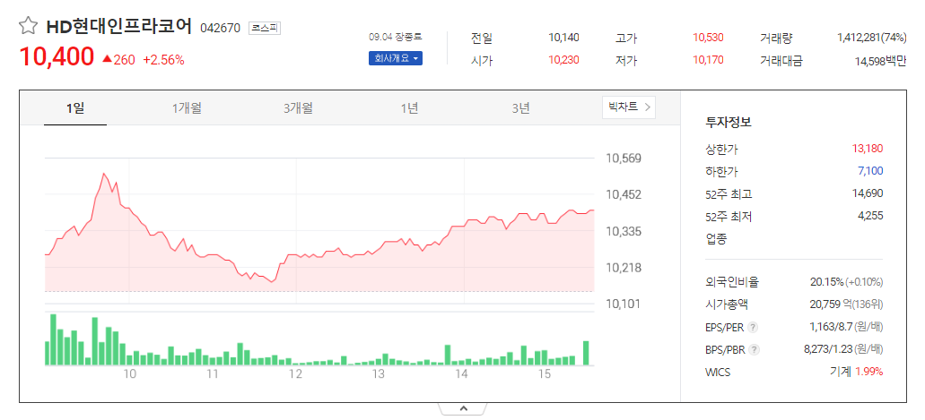 HD현대인프라코어 현재 주가는 10,140원이며 전일 대비 -390원의 모습을 보이고 있습니다. HD현대인프라코어의 주주현황을 살펴보면 현대제뉴인(외 1인)이 지분 33.00%를 소유하고 있습니다. HD현대인프라코어는 기계 기업으로 장중 기준으로 주가는 10,140원 입니다. 삼성전자의 시가 총액은 2조759억 원이며 발행 주식수는 20.15주 입니다. 외국인 보유 비중은 1,883,214% 이며 장중 거래량은 199,603,453를 기록했습니다. 매출액은 26,018억 원, 영업이익은 3,325억 원을 달성했습니다. EPS는 1,757원이며 HD현대인프라코어 주식 배당수익률은 3.00% 입니다.