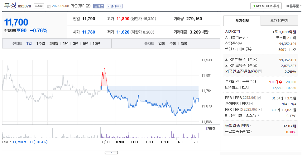 후성 현재 주가는 11,790원이며 전일 대비 -100원의 모습을 보이고 있습니다. 후성의 주주현황을 살펴보면 김용민(외 12인)이 지분 47.62%를 소유하고 있습니다. 후성는 화학 기업으로 장중 기준으로 주가는 11,790원 입니다. 삼성전자의 시가 총액은 1조1001억 원이며 발행 주식수는 2.20주 입니다. 외국인 보유 비중은 321,977% 이며 장중 거래량은 94,352,104를 기록했습니다. 매출액은 2,933억 원, 영업이익은 1,054억 원을 달성했습니다. EPS는 -100원이며 후성 주식 배당수익률은 11,124% 입니다.